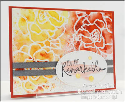 First think I (Connie) thought when I saw the Inspiration photo was…BRUSHO CRYSTALS! They are SO much fun to play with and create such interesting backgrounds and looks! Once I got started I couldn’t quit!