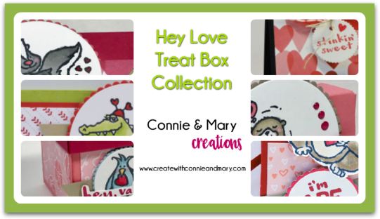 “Hey Love” is a FUN and whimsical stamp set just perfect for Valentines and not just for kids! We LOVE the SIX little treat boxes we’ve come up with for our Hey Love Valentine Treat Box Collection!!! They are just TOO “Stinkin’ Sweet”! In this Hey Love Collection, you’ll get the tutorials for SIX great treat boxes all designed by Connie and Mary!