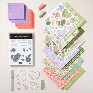 Stampin’ Up!’s FLOWERING CACTUS PRODUCT MEDLEY is a GREAT value and everywhere you look, cacti are featured as part of home décor! We loved the whimsical cactus images and “punny” greetings in the stamp set, so just had to use it for our next Collection! The Flowering Cactus Product Medley kit comes with stamps, dies, designer paper, felt flowers, and two colors of linen thread, everything you need to make it EASY to create! You’ll get FOUR unique tutorials that include three cards (one a special fold), and a fun organizing project!