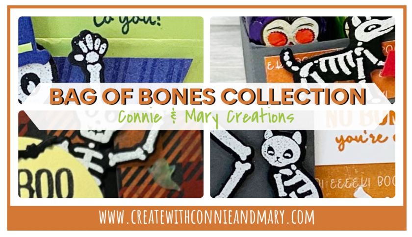 Check out these “jazzy” skeletons in the new BAG OF BONES BUNDLE! So many pieces to mix and max for personalized figures and scenes! Build a spooky scene with tombstones, bats, stars, and even a rickety picket fence using the BAG OF BONES DIES. This bundle is bone-a-fide fun with even a not-so-furry friend or two. Your Halloween crafts are sure to be eerie-sistible! We featured the BAG OF BONES BUNDLE with the THEM BONES DESIGNER PAPER for a spook-tacular collection! There are step-by-step instructions for TWO card designs and TWO treat holder projects!