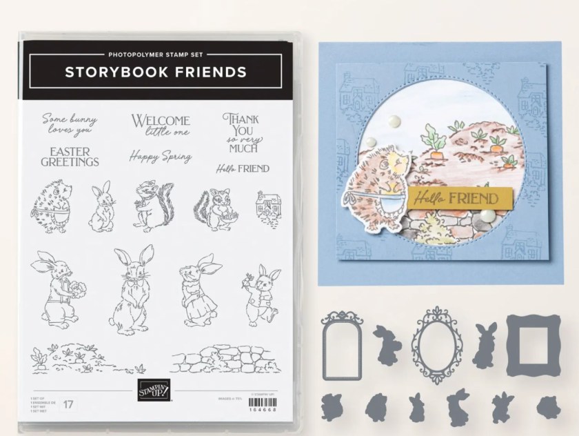 Bring on Springtime with Stampin’ Up!’s new STORYBOOK FRIENDS family of fuzzy-tailed critter stamps and dies! These well-dressed rabbits and other animals will bring a smile to your face and the recipient when creating your cards, scrapbook pages, or other paper projects! Add a stone wall, or garden of carrots and a sweet greeting to finish it off. Our STORYBOOK FRIENDS COLLECTION includes step-by-step tutorials for SIX projects…four cards and TWO cute favor boxes for your spring table or to give as a gift!