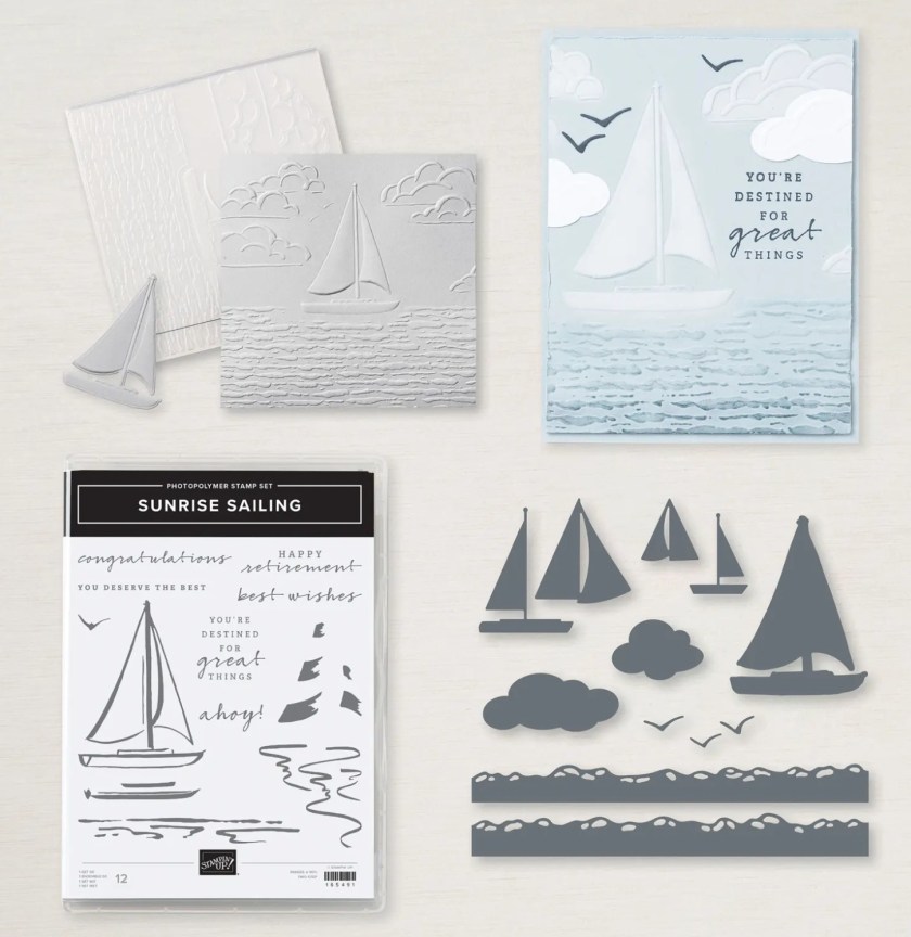Create beautiful sailboat scenes with a moving ocean and textured sky using Stampin’ Up!’s SUNRISE SAILING STAMP SET, DIES, AND HYBRID EMBOSSING FOLDER! You can fill your hand-made projects with waves, clouds, seagulls and different sized sailboats. We are also showcasing FOUR card techniques to use with the SUNRISE SAILING BUNDLE…we know you’ll have a blast making them! Our SUNRISE SAILING COLLECTION has EIGHT new card projects. We’ve paired the SUNRISE SAILING BUNDLE with the THOUGHTFUL JOURNEY 6×6 DESIGNER PAPER for a variety of gorgeous sky and water looks. You’ll get step-by-step tutorials for EIGHT cards…four using special techniques…that will be so fun to teach in your classes or make on your own!