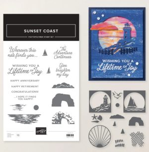 Be inspired by a trip to the coast when using Stampin’ Up!’s new SUNSET COAST BUNDLE*. This Bundle features sailboats, a lighthouse, seashells and rock formations to build the perfect oceanfront adventure. We’ve combined the SUNSET COAST BUNDLE and the SCENIC COAST 6×6 DESIGNER PAPER with dramatic sunset colors and iridescent shimmer for your cards and projects. You’ll get step-by-step tutorials for SIX projects…four cards and two favor projects that are perfect for classes and stamp camps!