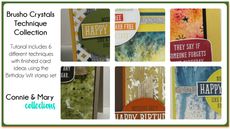 Brusho Crystals Technique Collection PDF only! Tutorial includes specific directions for SIX techniques using the fun Brusho Crystals on your cards, plus directions to finish the cards using the Birthday Wit stamp set or use a greeting set of your own. Find the details HERE!