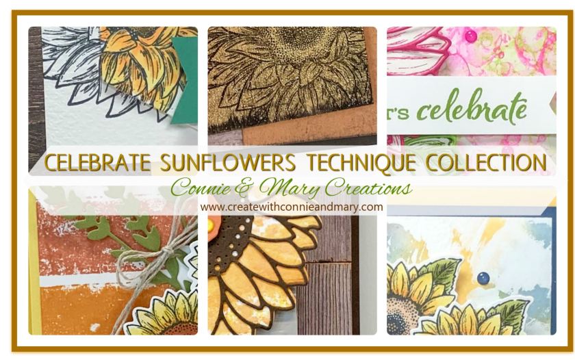 Our next release from Stampin’ Up!’s new Annual Catalog is the gorgeous CELEBRATE SUNFLOWERS TECHNIQUE COLLECTION with a BONUS! This Collection is a TWO for ONE! Not only do you get SIX creative card ideas using the Celebrate Sunflowers Bundle, you also will learn how to do SIX different background techniques! This allows you to focus on either the bundle OR the technique if you don’t have the bundle. See the details HERE! Email us at createwithconnieandmary@gmail.com for an invoice!