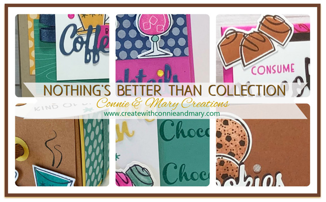 We love our next release from Stampin’ Up!’s new Annual Catalog called Nothing’s Better Than! This whimsical stamp set with dies has coffee, cookies, cocktails and chocolate images…definitely some of our favorite things! And we’ve combined them with the NEW In Colors! Our NOTHING’S BETTER THAN COLLECTION of tutorials is an EXPANDED Collection with SIX projects! You’ll get step-by-step instructions for FOUR cards and TWO small 3D favor projects…perfect for gift giving or upcoming craft fairs! See more details HERE! Email us at createwithconnieandmary@gmail.com for an invoice!