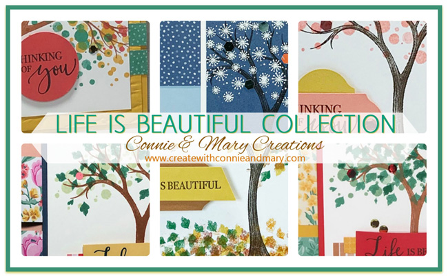 Do you love trees? We LOVE trees! We are kicking off the upcoming August-December Catalog (formerly called Holiday Catalog) with the gorgeous Life is Beautiful Stamp Set! It has a wonderful full-branch tree in it! This EXPANDED collection of SIX tutorials has FOUR frame insert ideas…one for EACH season…and TWO card ideas! These are easy enough to complete in one class, or split them into two classes by doing two seasons and a card each class! You also could include the Life is Beautiful Stamp Set for an awesome product class! See more details HERE! Email us at createwithconnieandmary@gmail.com for an invoice!