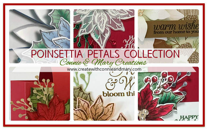 Our first Christmas collection for the season is the beautiful POINSETTIA PETALS SUITE of products in a variety of colors! Our POINSETTIA PETALS COLLECTION has FOUR cards and two small 3D projects, perfect for the upcoming Christmas holiday, for a total of SIX brand new tutorials! See more details here! Email us at createwithconnieandmary@gmail.com for an invoice!